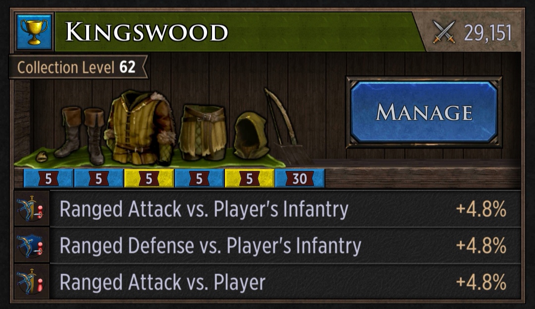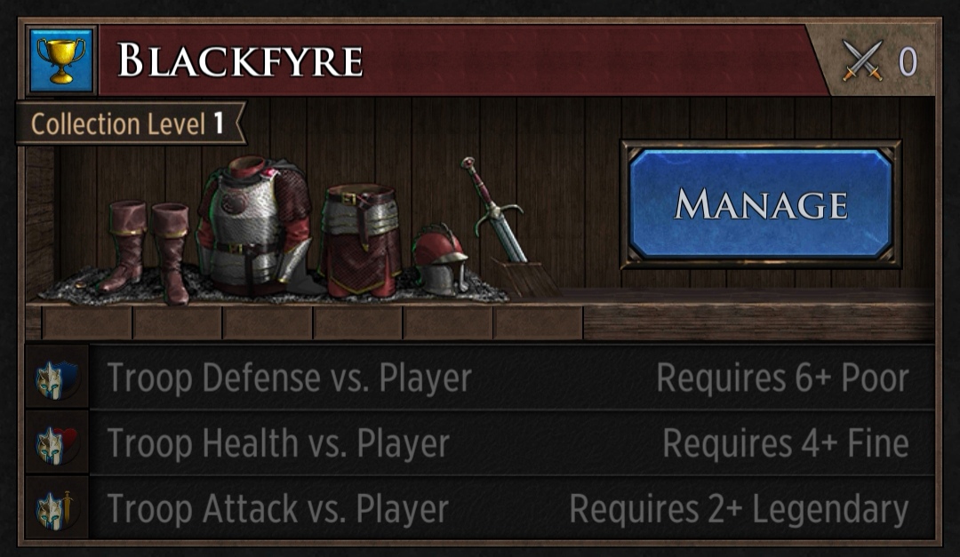After I put some leftover gear and crafted some low level gear to fill all stats in the other troop specific Armorys I focused on the Blackfyre Armory.